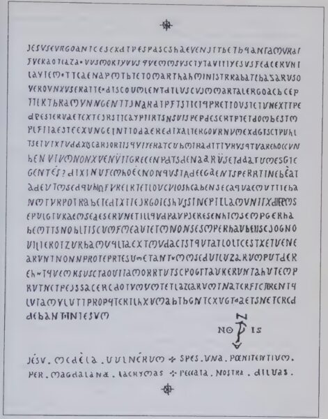 But then, after attempting to hide his tracks, Saunière turned around and did the exact opposite. Sède was convinced that he embedded clues about the location and the origin of the treasure everywhere in and around his church as part of his renovations. These clues could be extremely abstruse. For example, at the base of the new altar is a phrase in Latin meaning “Jesus, healer of wounds, the one hope of penitence through the tears of Magdalene, wash away our sins.” But it’s written in an odd way.