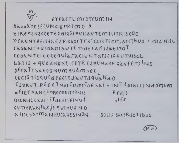 The first and longest of the two documents, which I will refer to from now on as Altar Document 1, is superficially an extract from the Gospel of John, in which Jesus visits the home of Lazarus, whom he has raised from the dead, and has his feet anointed with oil by Lazarus’s sister Mary. Altar Document 2 contains an incident which is related in almost the exact same words in the Gospels of Mathew, Mark, and Luke, in which Jesus gives his hungry followers permission to eat corn on the Sabbath. Sède’s book remains to this day the only source we have for both Altar Document 1 and 2; the originals, presuming they ever existed, have never turned up. Let’s have a look at the copies and see what they might be trying to tell us.