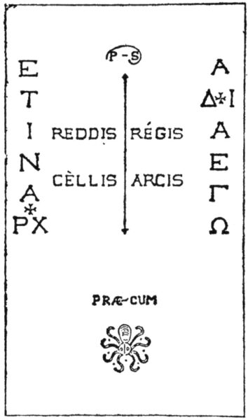 Gravestone 1. Sède states in his book that the inscription above was once to be found on the gravestone of Marie de Nègre. The horizontal writing is in Latin, consisting of the words “Rennes”, “king,” “caves”, and “citadel” above and “before-with” below. The two vertical columns are Greek letters, spelling out nothing in particular in that language.