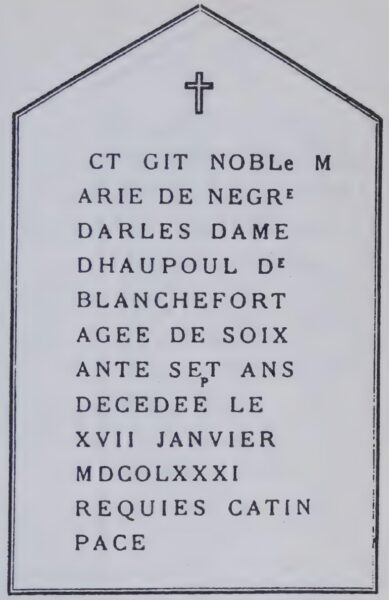Written in French with the exception of a concluding phrase in Latin, the inscription ought to read, Ci gît noble Marie de Negre d’Ables de Blanchefort, âgée de soixante-sept ans, décédée le XVII Janvier MDCCLXXXI. Requiescat in pace. (“Here lies the noble Marie de Nègre d’Ables de Blanchefort, aged 67 years, deceased January 17, 1781. May she rest in peace.”) But a careless or illiterate stone carver has apparently made a right hash of it. He’s misspelled several words, missed a few letters which he all too obviously filled in later, had trouble with his word-wrapping, and replaced a “C” with an “O” in the Roman numeral marking the year of Marie’s death. The most amusing mistake is his failure to split the Latin Requiescat in pace properly, resulting in the word Catin — an old French term for a woman of the night.