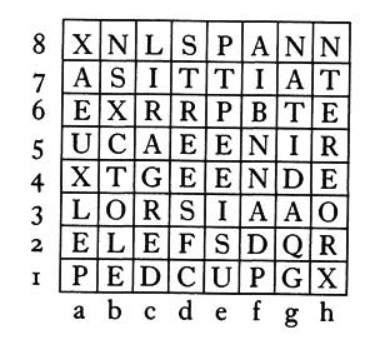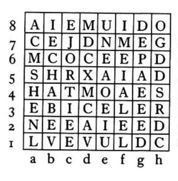 Finding the message in the jumble of letters relies on an exercise known as the Knight’s Tour, which is as well known to students in university mathematics and computer-science departments as it is to chess players. Starting from any square on the board and obeying the standard movement rules for a knight — one square vertically and two squares horizontally, or vice versa — we want to move a chessman so that it visits every square on the board exactly one time, without ever revisiting a square.