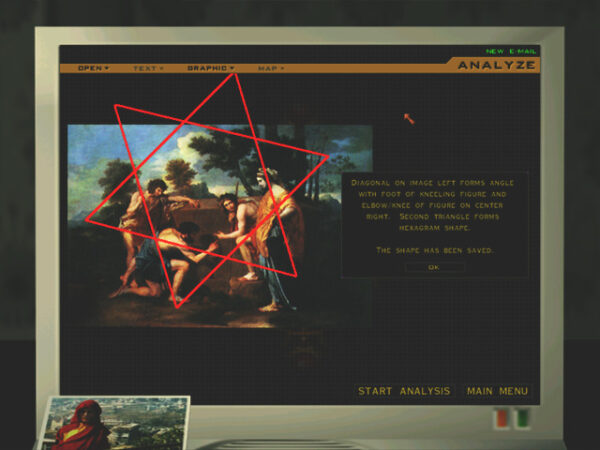 Like much else that I’ve mentioned today, the pentagon that is allegedly hidden in the Poussin painting shows up in Gabriel Knight 3′s Le Serpent Rouge puzzle sequence.
