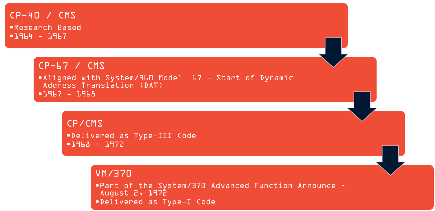 The original System/360 had a “Virtual Machine Monitor”; this was the overarching master system that made contact with the “metal” of the mainframe. Within this was built a CMS (Conversational Monitor System) which essentially appeared to the user like a “personal computer”; this was a way to do timesharing in a way that was essentially seamless. The user could treat the device in front of them as their own.