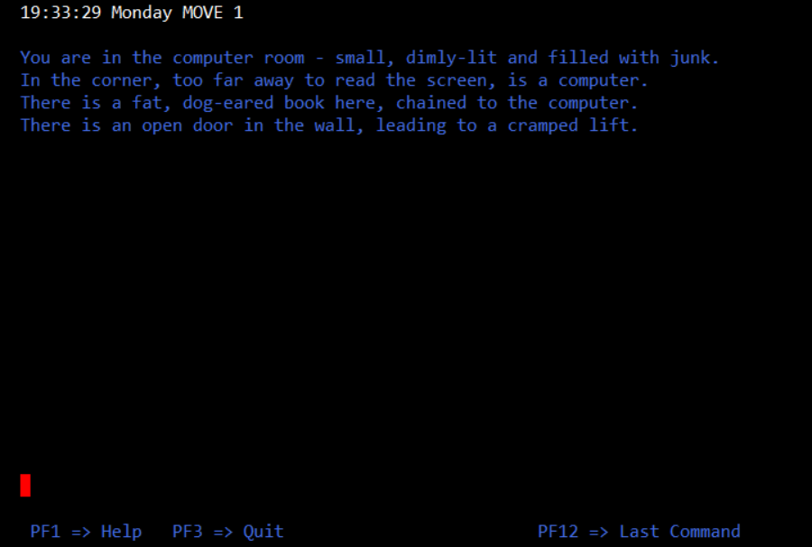 This game generally speaking hasn’t been available for ages; it was designed to work on an IBM mainframe which was only running a short time, and it only re-appeared on the internet 5 years ago when the author (Mitchell) got the game up and running with Hercules (an emulator for running old IBM virtual machines). The part of his website that held the download is now defunct but it was rescued by Robert Robichaud (Rob in our comments); getting it running was also a Herculean feat but Gunther Schmidl managed to create a package you can download here. (As a word of warning, your virus detector may not like the setup as it runs an open port; I had to turn it off to play the game.)