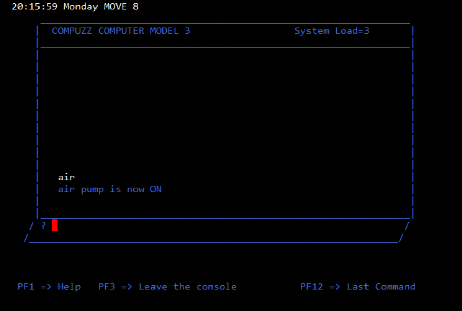 Early on messages start like “the air here is a bit stuffy”. Like Suspended (and Starcross) there are environmental problems going on, and the first thing to do is to start the air pump (this is mentioned explicitly in the directions).