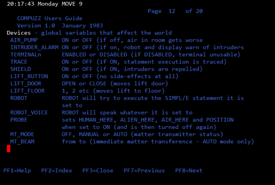 All this is relevant today because not only is today’s game ZENO written in Rexx (back when the language was still internal to IBM), ZENO is a “programming game”; you are at a central computer controlling robots with programming. Regarding programming games in general, I briefly touched upon the game OMEGA in my writeup of Pillage Village; I also recommend Data-Driven Gamer’s series on the classic (and extremely difficult) Robot Odyssey. We’ve never had any that are also adventure games. (There’s some linkage to Suspended, but ZENO ends up being very different.) I’ll give the details on how ZENO works in a moment, but let me jump back to the 60s again and follow our author, hopping geographically over the Atlantic.